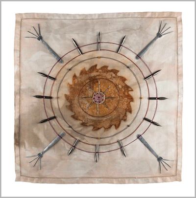 Materials: Cloth napkin (rust dyed with saw blade), vintage pen nibs, wire, beads, vintage toy forks, thread