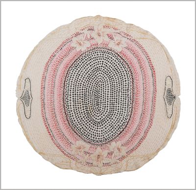 Autobiographical in nature, Motherhood: VOID recorded my feelings related to motherhood, or the lack thereof. The foundation of the piece, a circular vintage textile, includes visual references to an empty womb and ovaries, and the pink colors allude to internal reproductive organs. This piece is the first of four pieces in my Motherhood series.