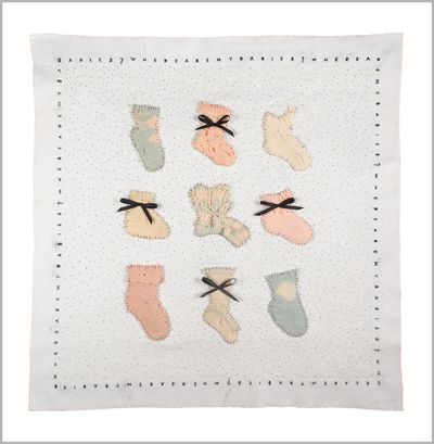 This is the fourth and final piece in the Motherhood Series. Soft and sweet at first glance, Where Are My Babies? features vintage textiles and hundreds of stitches. Upon closer inspection tension builds, as the details come into focus: the unraveling and decaying baby booties and the endless stream of repeating words that line the four edges of the piece. “Where are my babies?”